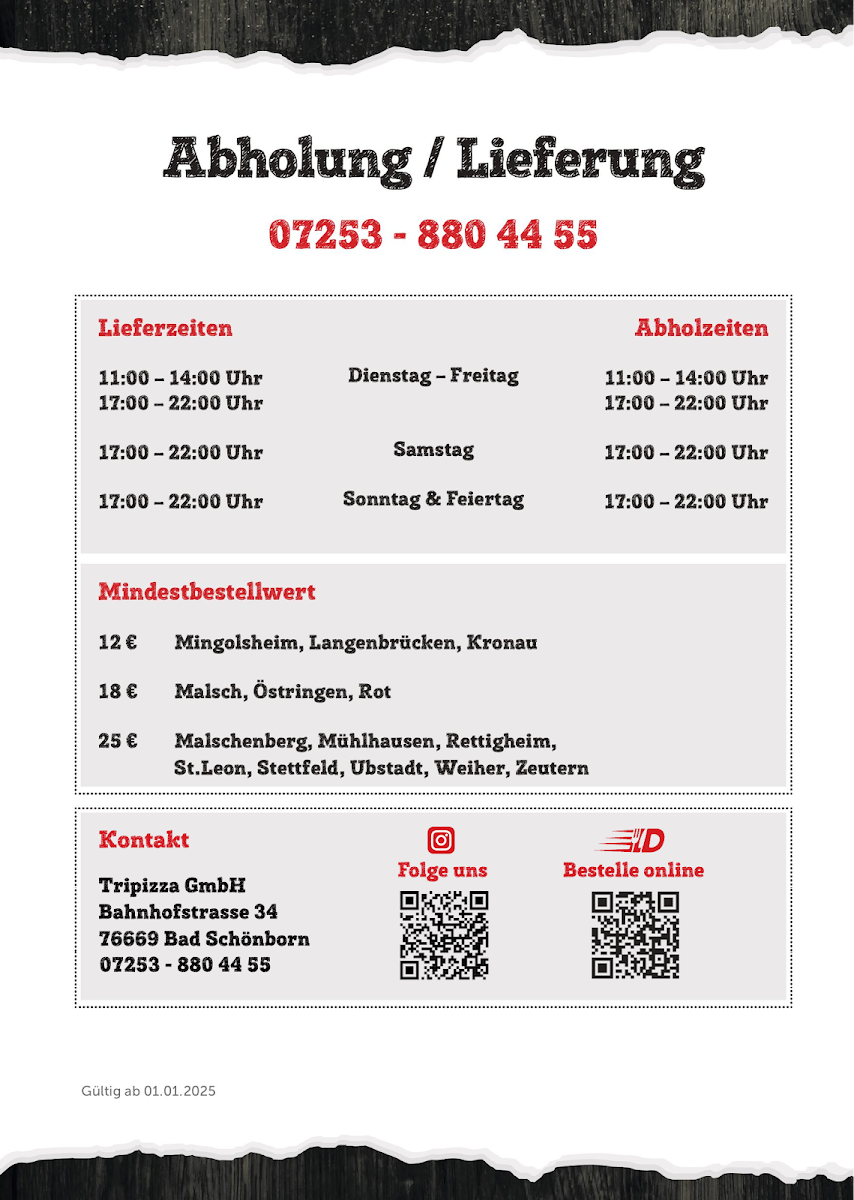 Welcome to Tripizza, your go-to destination for authentic Italian pizza in Bad Schönborn, Germany. Located at Bahnhofstraße 34, this delightful eatery specializes in pizza delivery and takeaway, offering a menu that speaks to the heart of Italian cuisine.